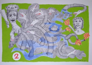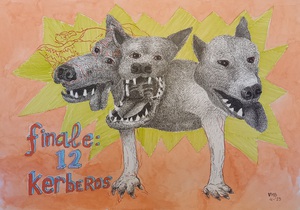 2023Afmetingen 28 x 41 cm Discipline Tekenkunst Techniek kunstwerk Watervaste inkt aquarell en potlood en gouache Dit kunstwerk behoort tot de serie Dodekathlos - De werken van Herakles Bijkomende info : Voor de laatste opdracht voor koning Eurysteus moet Herakles de hellehond Kerberos (Cerberus) ontvoeren uit de onderwereld. Er zijn diverse beschrijvingen van de hond maar uiteraard heeft geen levend mens de hond ooit in het echt gezien. In mijn verbeelding ziet hij er dus uit als op de tekening. In elk geval wel op het moment dat ik met de tekening bezig was. Ik sluit niet uit dat hij er heel anders uit zou zien als ik de tekening op dit moment zou beginnen. In mijn werken staat weinig vast dus ook niet hoe een hond met drie koppen eruit moet zien. Zeker niet een hond die nog geen levend mens ooit heeft gezien omdat de hond in de onderwereld leeft.