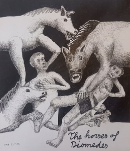 2023Het achtste werk in mijn serie over de werken van de griekse held Herakles. In opdracht van koning Eurysteus moest Herakles de paarden van koning Diomedes vangen en bij hem brengen. De wrede koning Diomedes gaf de paarden mensenvlees te eten. Tijdens de opdracht werd Abderos, de vriend en geliefde van Herakles, door de paarden verslonden. Herakles heeft vervolgens Diomedes door zijn eigen paarden laten verslinden.