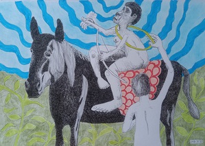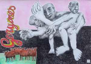 2023De tiende opdracht die Herakles voor koning Eurysteus moest uitvoeren was het stelen van de runderen van de reus Geryones. Deze reus een heeft volgens de verhalen maar liefst drie hoofden en drie paar armen en benen.In mijn fantasie ziet hij er uit als op mijn tekening.